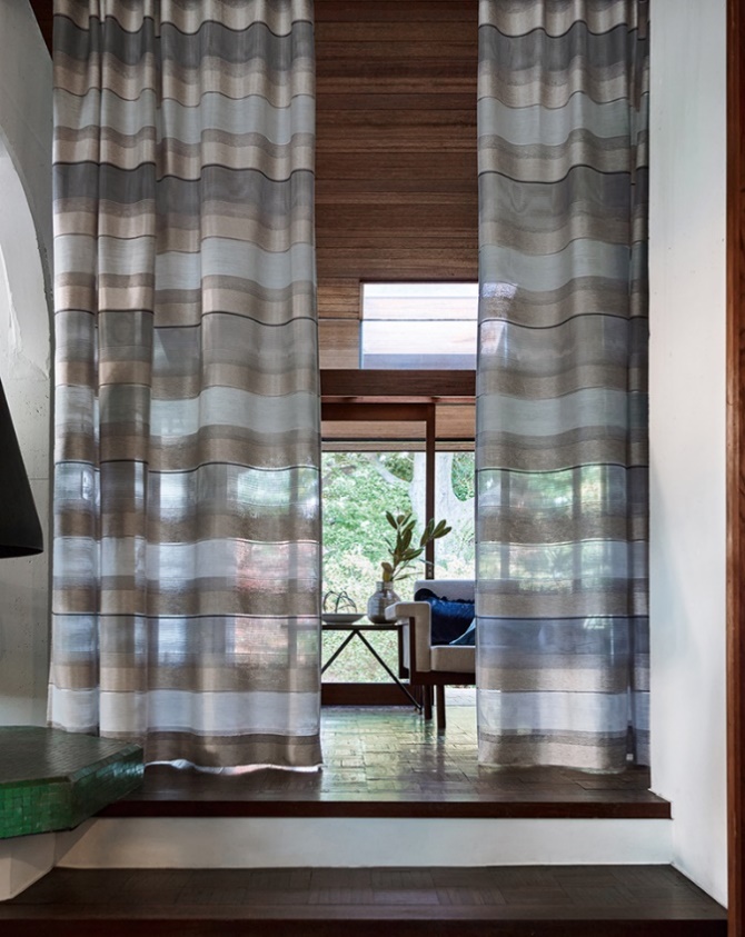 ベルベット調の透けない部分と麻ライクで風通組織の透ける部分が構成されたハーフトランスペアレンスです。3m巾でタテにもヨコにも使用できます。ベルベット調に見える部分は艶のあるモール糸をとゴールドの光沢糸を織り込み、風通部分はモアレが見えます。素材感にこだわった高級感ある質感が特徴です。